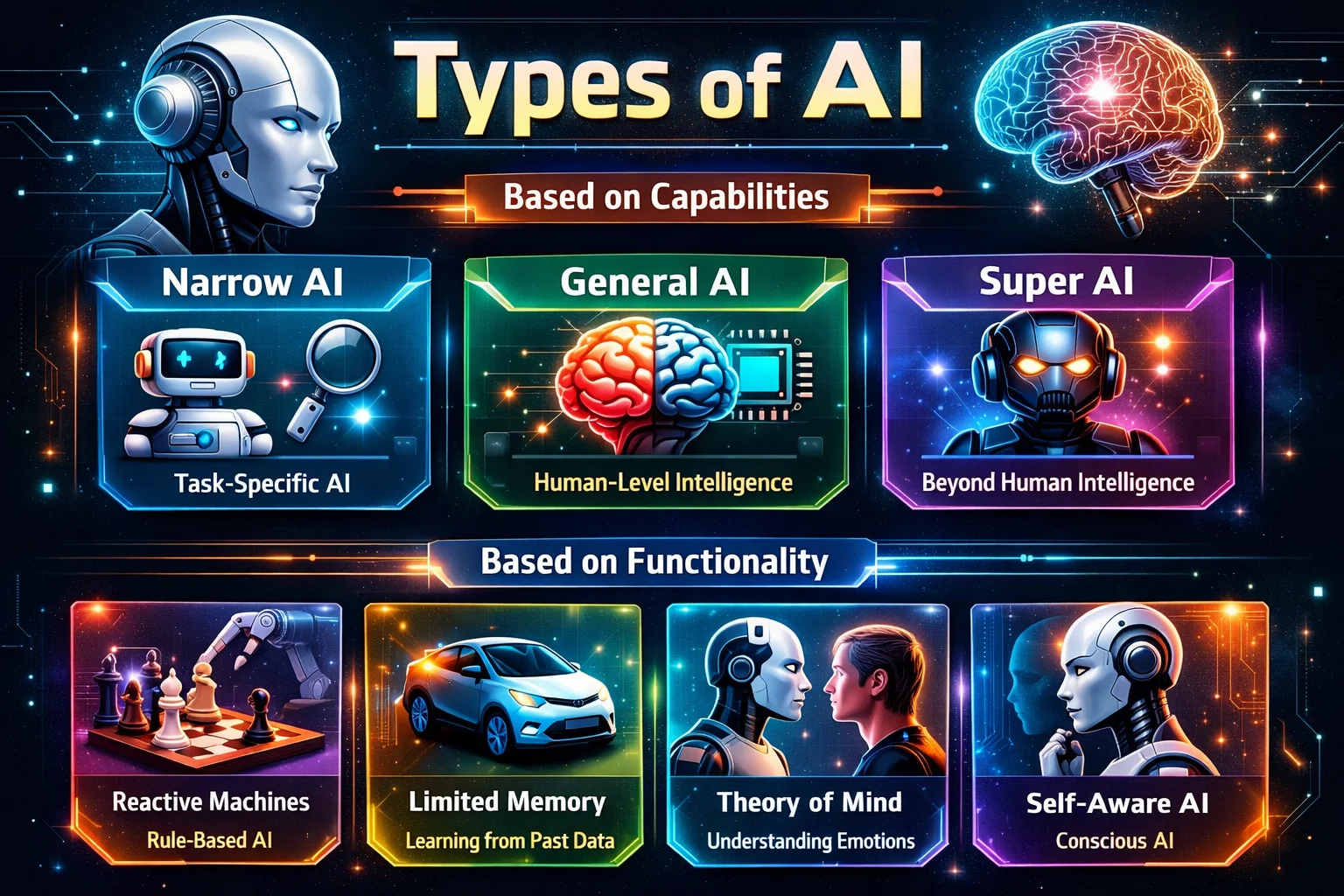 Experts usually group Artificial Intelligence into types based on what it can do and how it works.
